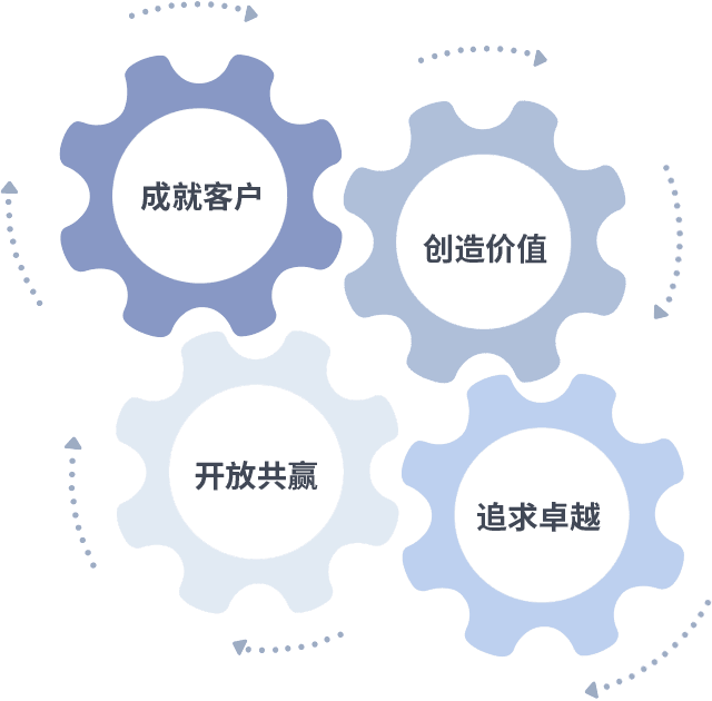 成就客户是一切决策的出发点,,,创造价值是衡量所有工作的标准,,,追求卓越是我们做事做人的态度,,,开放共赢是我们的格局也是最终的结果。。价值观的齿轮环环相扣,,,,推动着组织里的每个人不断向前。。